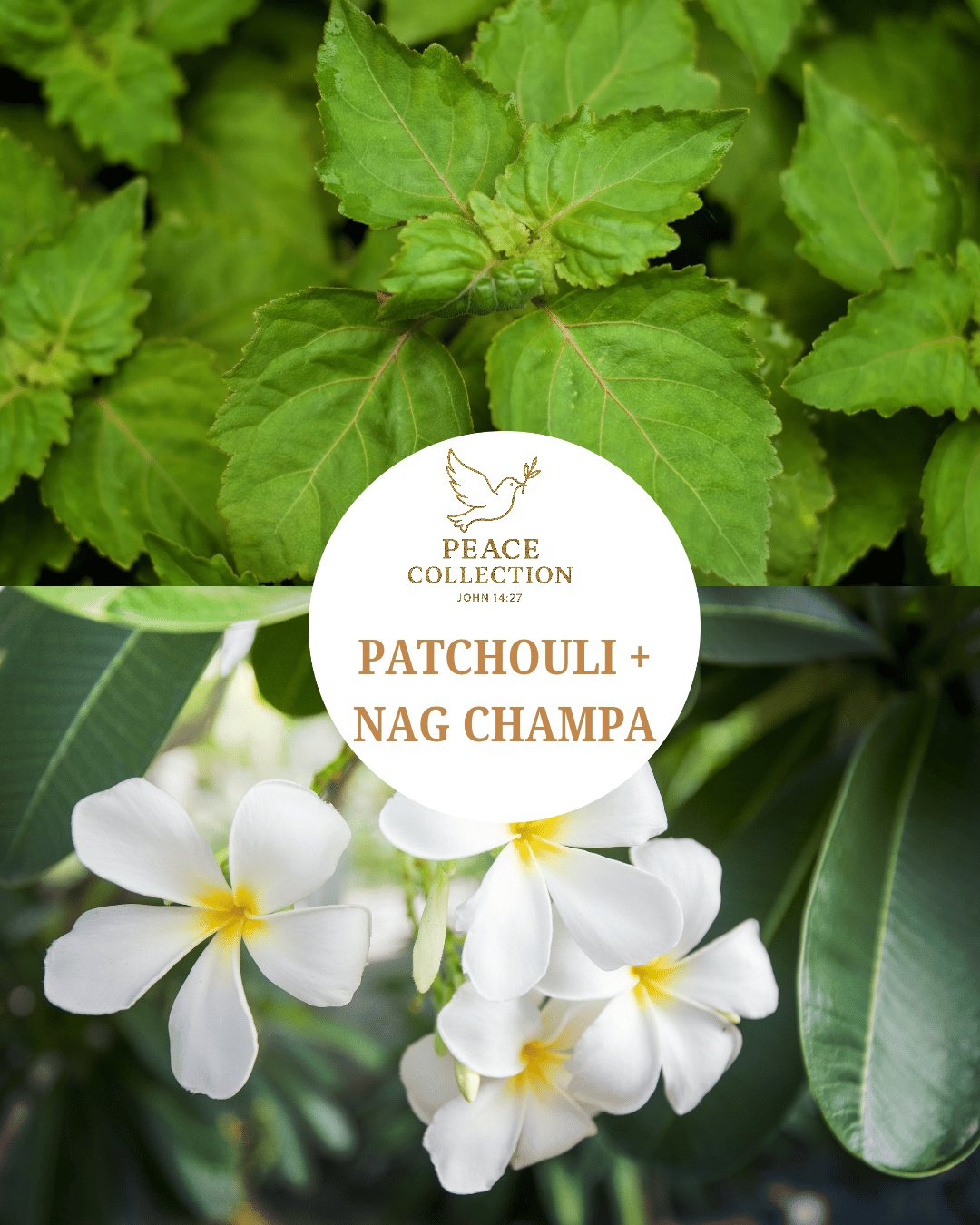 NAG CHAMPA + PATCHOULI: The combination of NAG CHAMOA + PATCHOULI is a reminder that peace isn't always soft. Peace can be bold, rooted and deep. A soulful retreat. A fragrant offering. A deep, musky, earthy aroma that nudges us to Genesis 2:7,"...Then the Lord formed man from the dust of the ground."